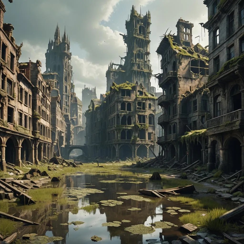 Hilda heard the whirr of a drone. Sludge sucked at her protective suit as she made her way back to the sled with more copper pipes. The suit hindered mobility sometimes, particularly her fingers, but better that than the rot of acidic mud on flesh. The greenish muck coating the streets of the old city wasn’t deep here, only midway up her calf. Tide lines showed on her hips from deeper in the city, where the ruined skyscrapers threatened to shift and collapse at any moment. The drone be-beeped as greeting. Chuff, her twelve foot domesti-gator, let out a low growl. He loved chasing drones, but kept still while his roll-harness was attached to the sled.